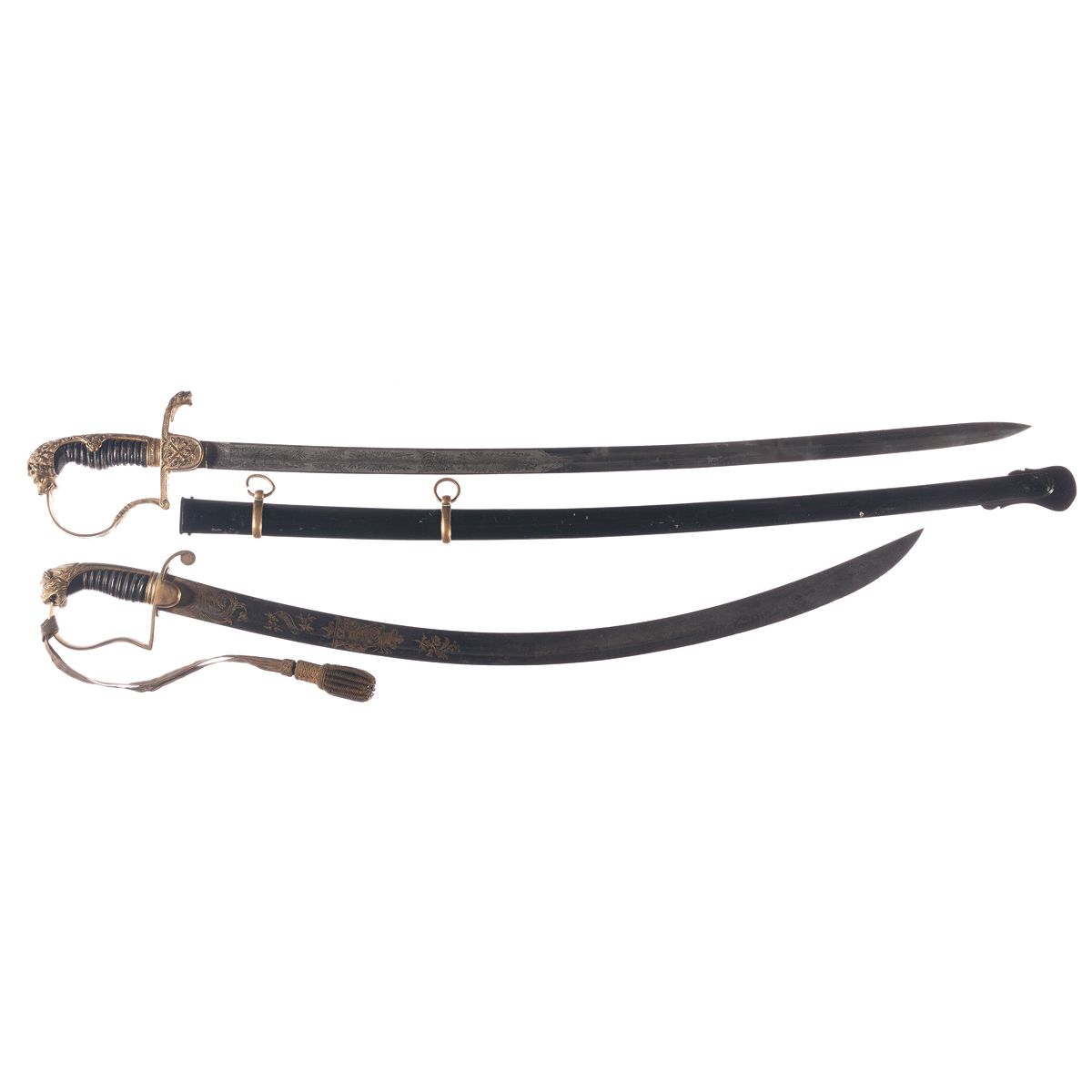 1) Lion pommel sword, 34" etched single fuller blade, crossed cannon languet, stirrup guard, wood grip, metal sheath. Good. 2) English lion pommel saber, 30" single fuller blade with gold washed engraving, wire and leather grip, and gold sword knot. Good.