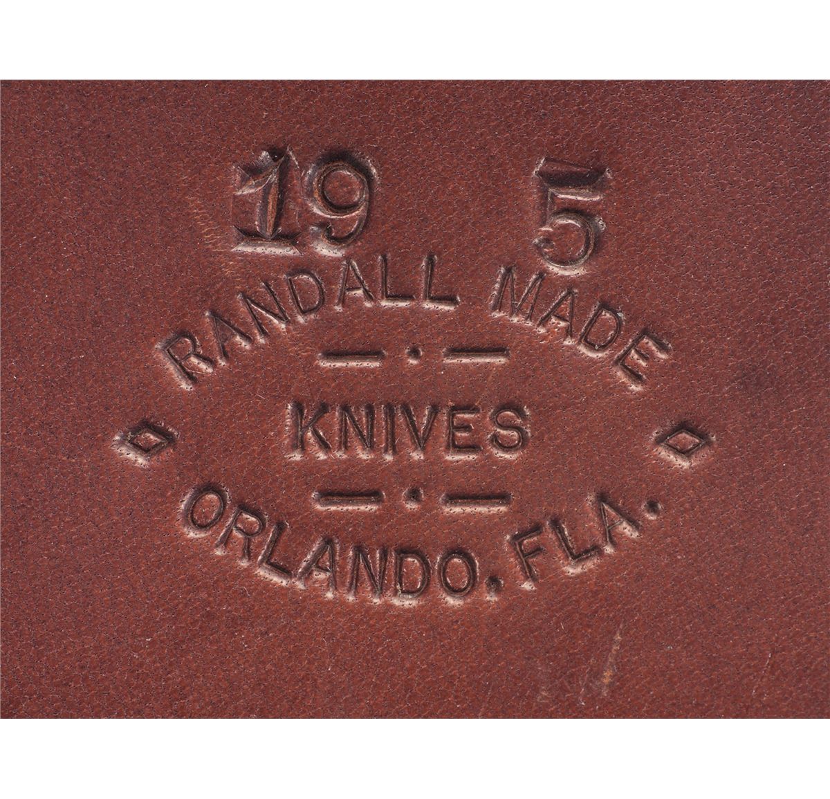 1) Randall 19-5 knife with a "19 5" marked Randall leather sheath. OAL 9 3/4 inches, 5 inch blade. This particular example has an inscription of both sides of the blade. The right side: "KEVIN THOMAS TROLLER" over the two line Orlando address followed by "S" over "EAGLE SCOUT 31-98". The left side: "THE TRUTH WILL SET YOU FREE/JOHN 8:32/MOM AND DAD". Brass guard, thumb rest on blade, and finger groove stag handle. 2) Randall Model 5 knife with a "5" marked Randall leather sheath. OAL 9 1/2 inches, 5 inch blade. Two line address, thumb rest on blade, brass guard, and stag handle.