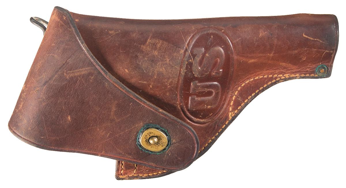 Condition: Very fine. The revolver retains 85% thin original parkerized finish with some minor scratches and some light edge wear. The hammer and trigger retain 90% original case colors. The grips are fine with minor chip on the bottom edge and a minor gash on the right panel, along with some minor dings and scratches. The holster is very good with some minor handling marks. The stitching is tight.