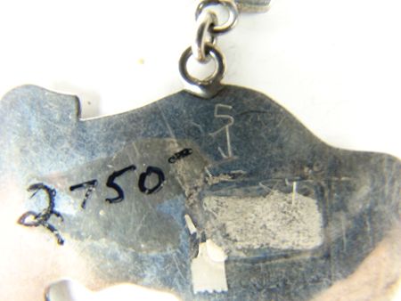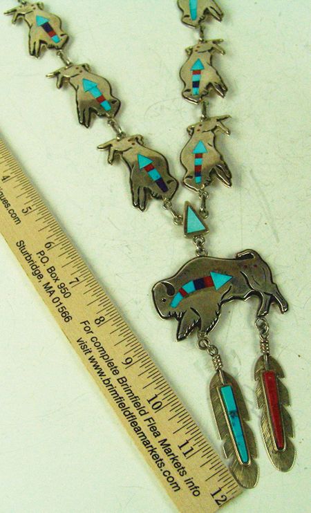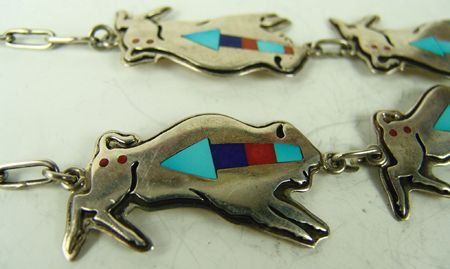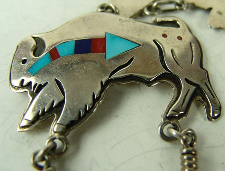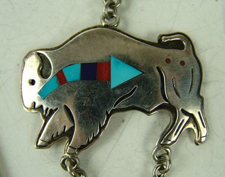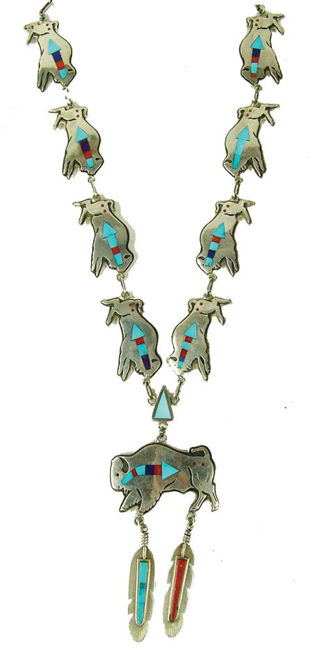 Ca. 1989, Unique original design silver overlay section necklace with buffalo figures, the larger pendant with feather drops. Each with a heartline inlay arrow. Signed "SJG89." Very good condition, light use. 25", pendant 5-1/2" x 2-1/2"