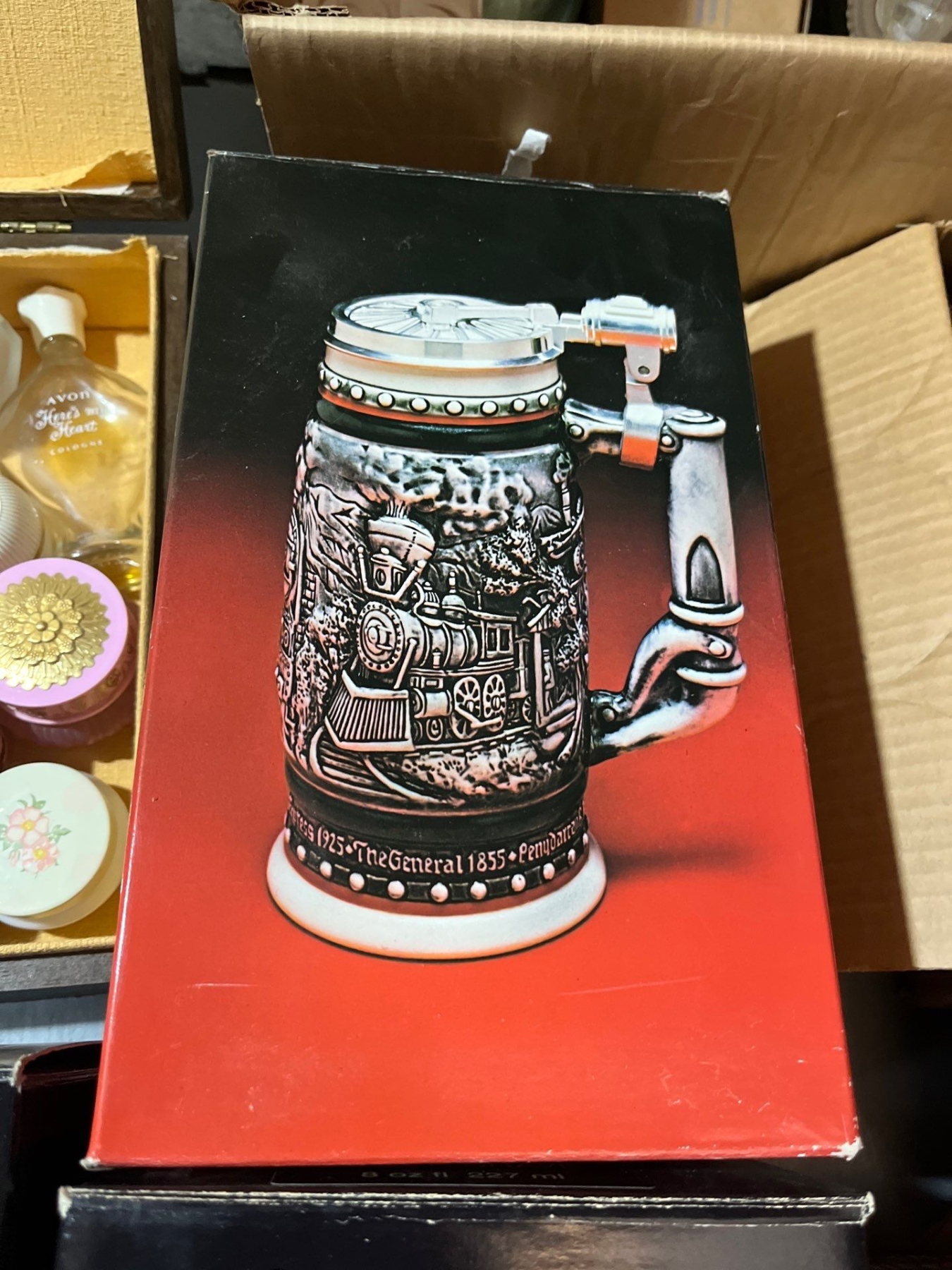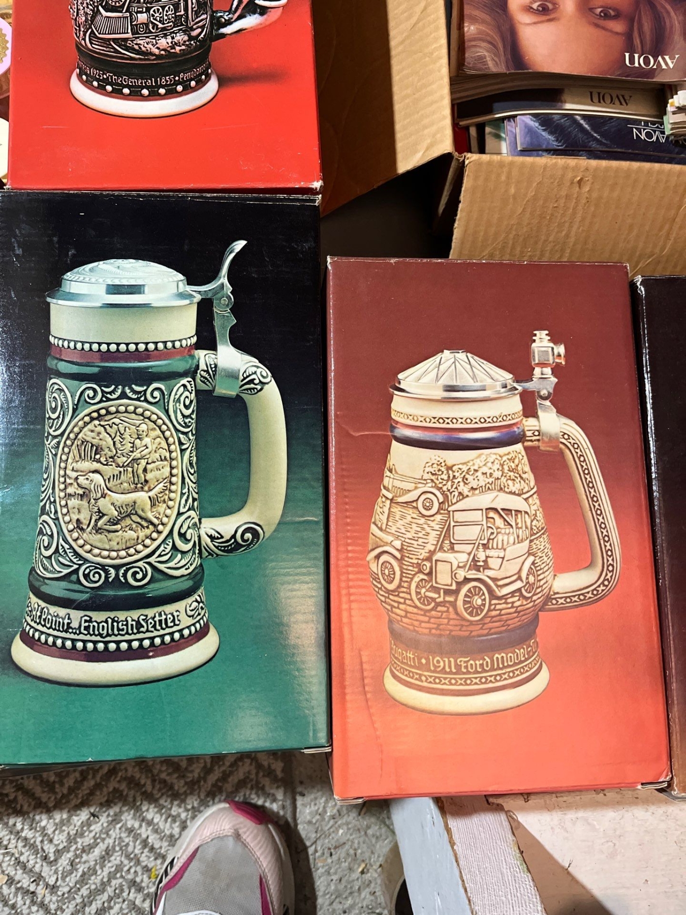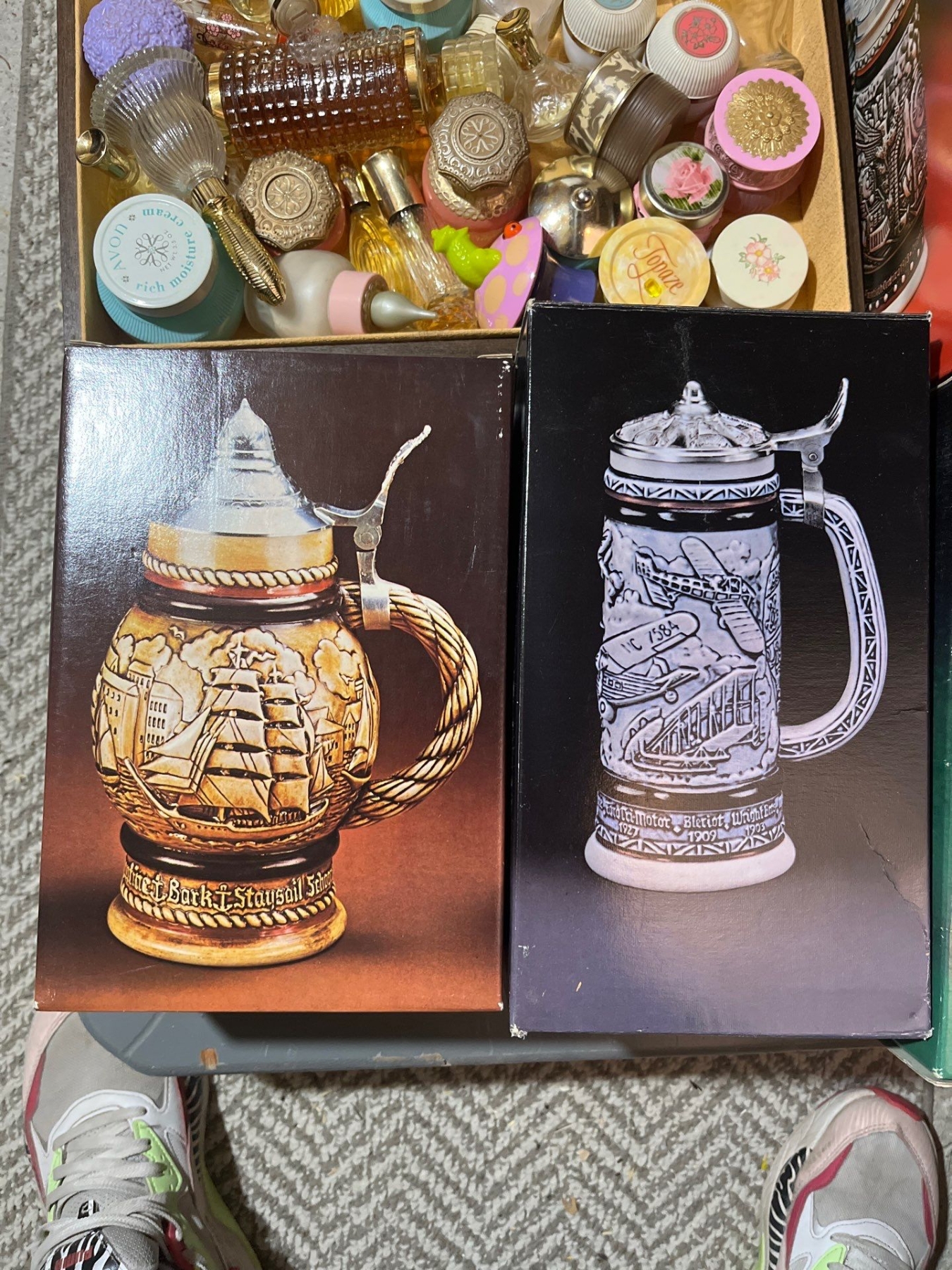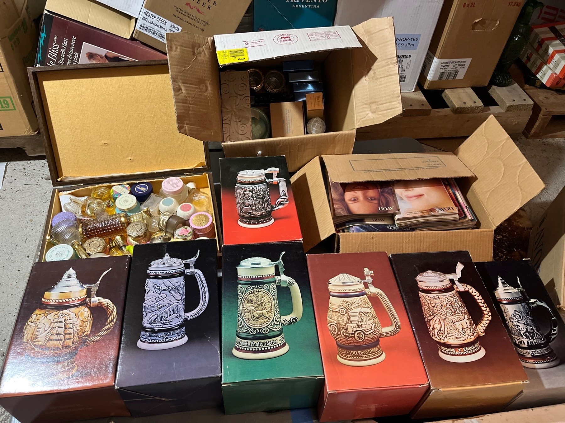 -AVON collection of Steins several small perfume bottles, large box of unopened, perfumes and soaps large box of vintage Avon magazines also sold together as one lot for the amazing Avon collector.