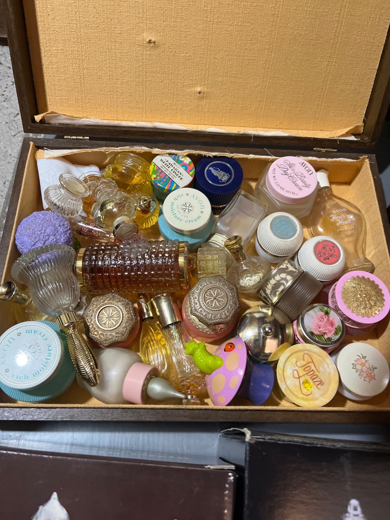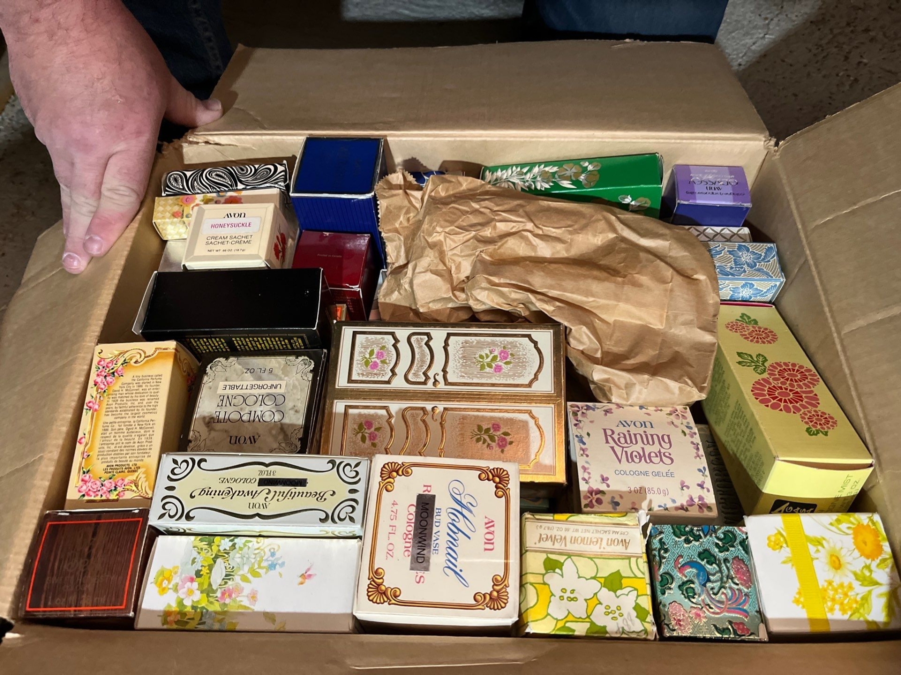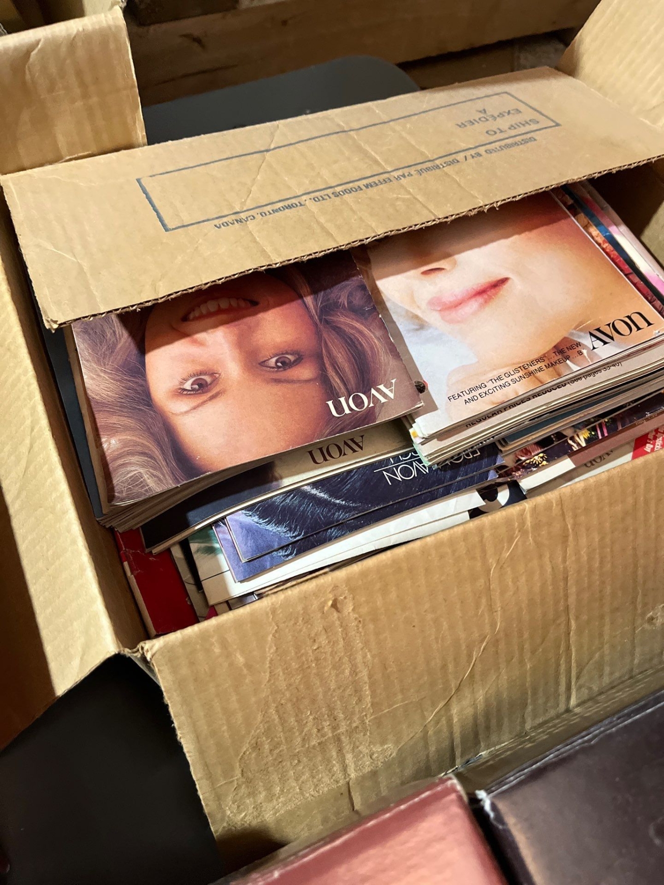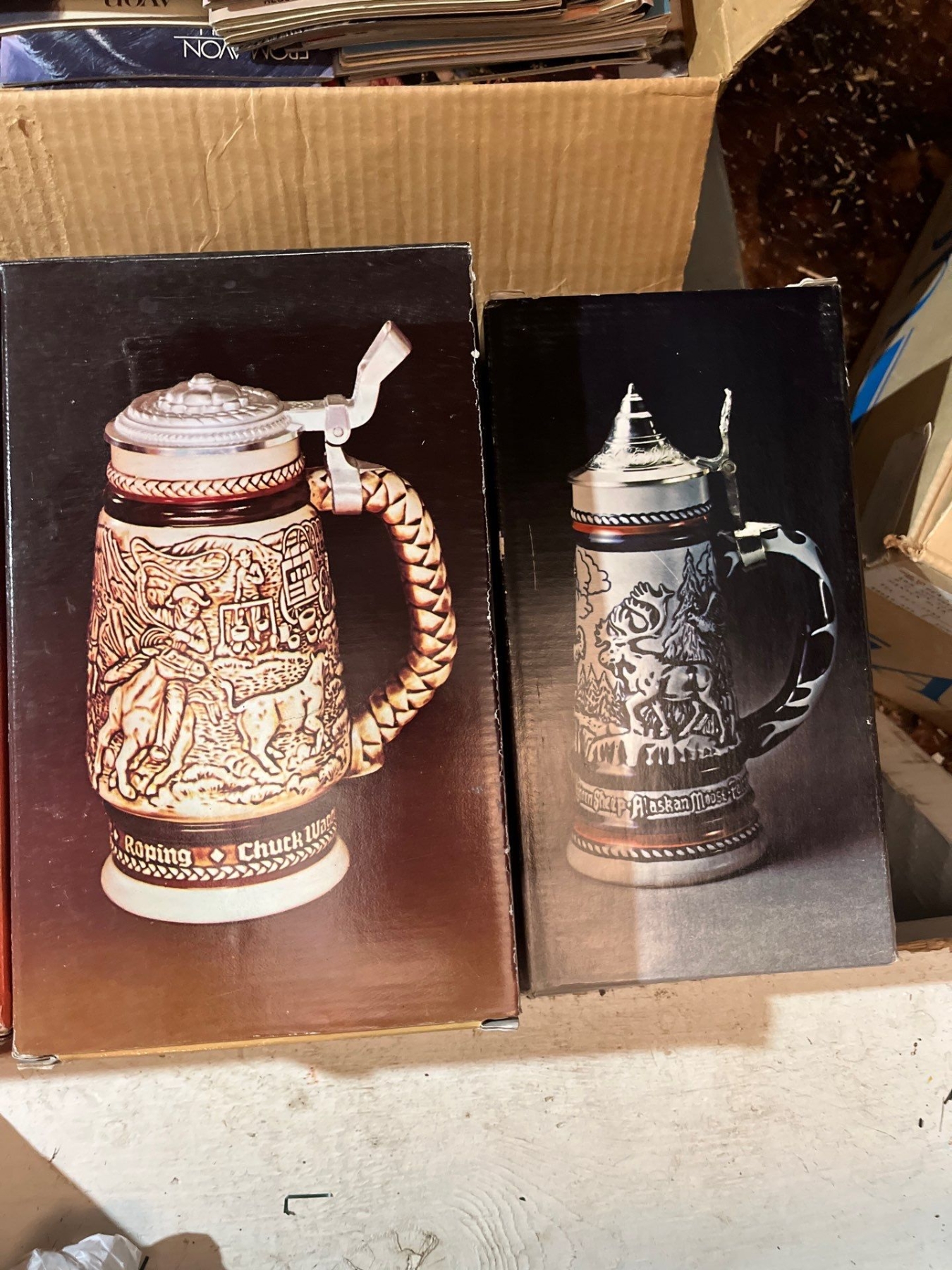 -AVON collection of Steins several small perfume bottles, large box of unopened, perfumes and soaps large box of vintage Avon magazines also sold together as one lot for the amazing Avon collector.