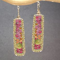 Metal: Gold Hammered rectangles with pink ruby, carnelian, and peridot wrapped around inside, about 2-1/4" long. Available in either 14K gold-filled, rose gold-filled, or sterling silver. All jewelry is entirely handmade in our studio in New York.