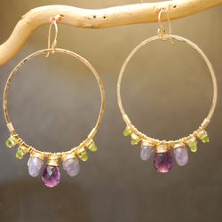 Metal: GoldLarge hoops wrapped with peridot, tanzanite, amethyst, and blue topaz, about 2-3/4" long.Available in either 14K gold-filled, rose gold-filled, or sterling silver. All jewelry is entirely handmade in our studio in New York.