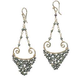 Metal: GoldYour choice of seed pearl wrapped on hammered chandelier shapes (black peacock and ivory pearl shown), about 2-1/4" long. Available in either 14K gold-filled, rose gold-filled, or sterling silver. All jewelry is entirely handmade in our studio in New York.