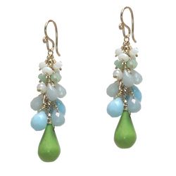 Metal: Gold Clusters of peruvian opal, amazonite, and lime turquoise magnesite, about 1-3/4" long. Available in either 14K gold-filled, rose gold-filled, or sterling silver. All jewelry is entirely handmade in our studio in New York.
