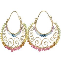 Metal: Gold Hammered hoops wrapped with peridot, citrine, mandarin garnet, pink ruby, aquamarine, amethyst, and blue topaz, about 2" long. Available in either 14K gold-filled, rose gold-filled, or sterling silver. All jewelry is entirely handmade in our studio in New York.