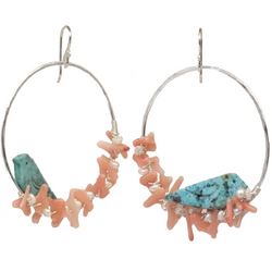 Metal: RoseGold Hammered hoops with turquoise bird, ivory pearls, and pink coral, about 1-3/4" long. Available in either 14K gold-filled, rose gold-filled, or sterling silver. All jewelry is entirely handmade in our studio in New York.