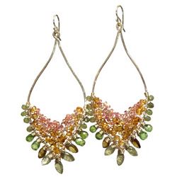 Metal: RoseGold Hammered marquise shapes wrapped with pink ruby, orange sapphire, mandarin garnet, green garnet, and peridot, about 2". Available in either 14K gold-filled, rose gold-filled, or sterling silver. All jewelry is entirely handmade in our studio in New York.