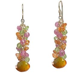 Metal: RoseGold Clusters of pink ruby, peridot, and carnelian, about 1-3/4" long. Available in either 14K gold-filled, rose gold-filled, or sterling silver. All jewelry is entirely handmade in our studio in New York.