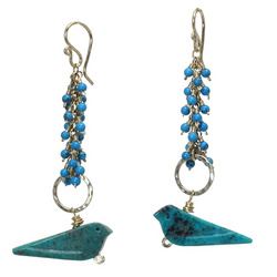 Metal: SilverTurquoise rondelles and turquoise birds on hammered rings, about 2-3/4" long.Available in either 14K gold-filled, rose gold-filled, or sterling silver. All jewelry is entirely handmade in our studio in New York.