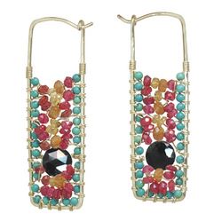 Metal: Silver Hammered rectangles with turquoise, pink ruby, mandarin garnet, and black spinel wrapped around inside, about 2-1/4" long. Available in either 14K gold-filled, rose gold-filled, or sterling silver. All jewelry is entirely handmade in our studio in New York.