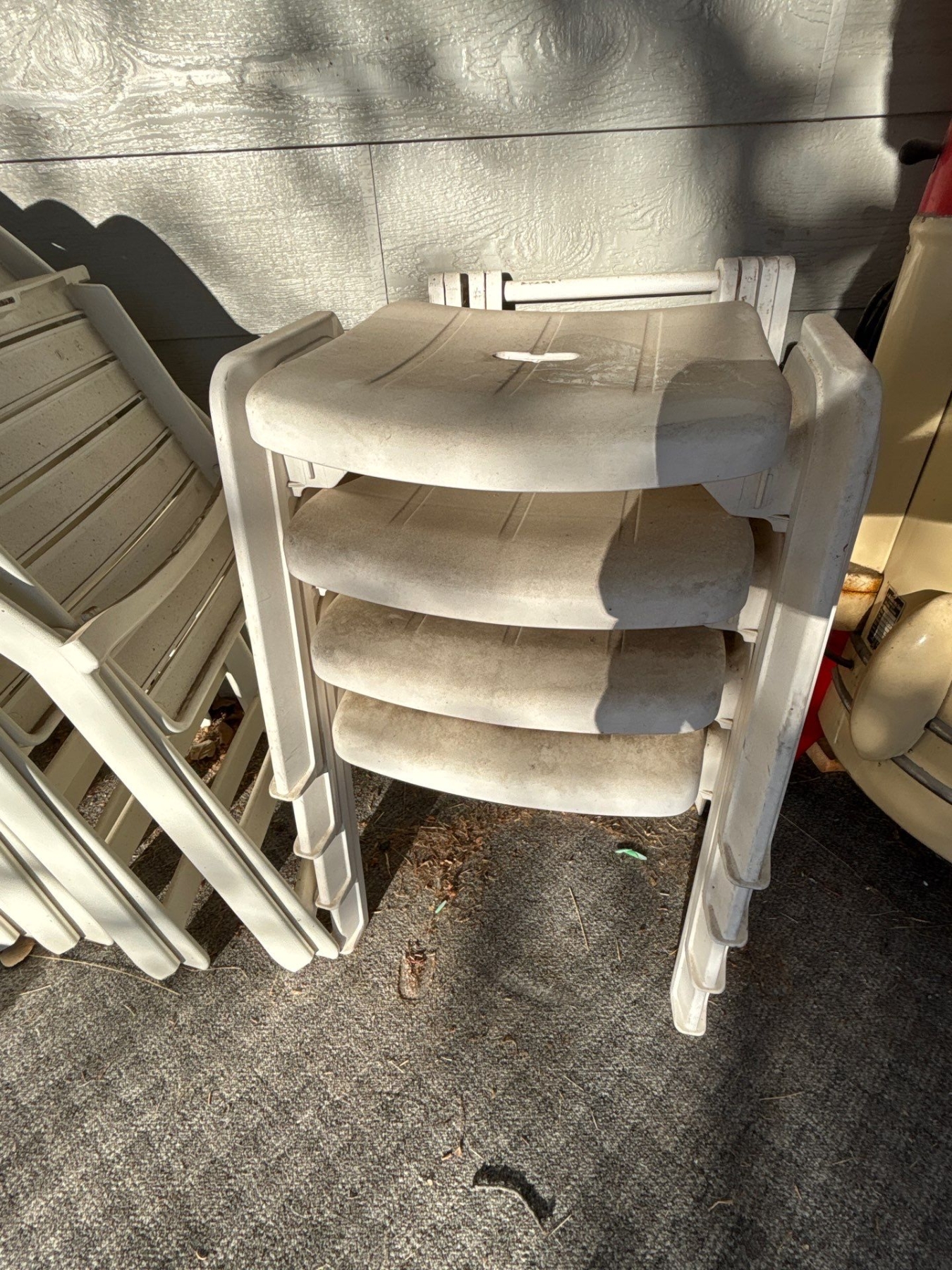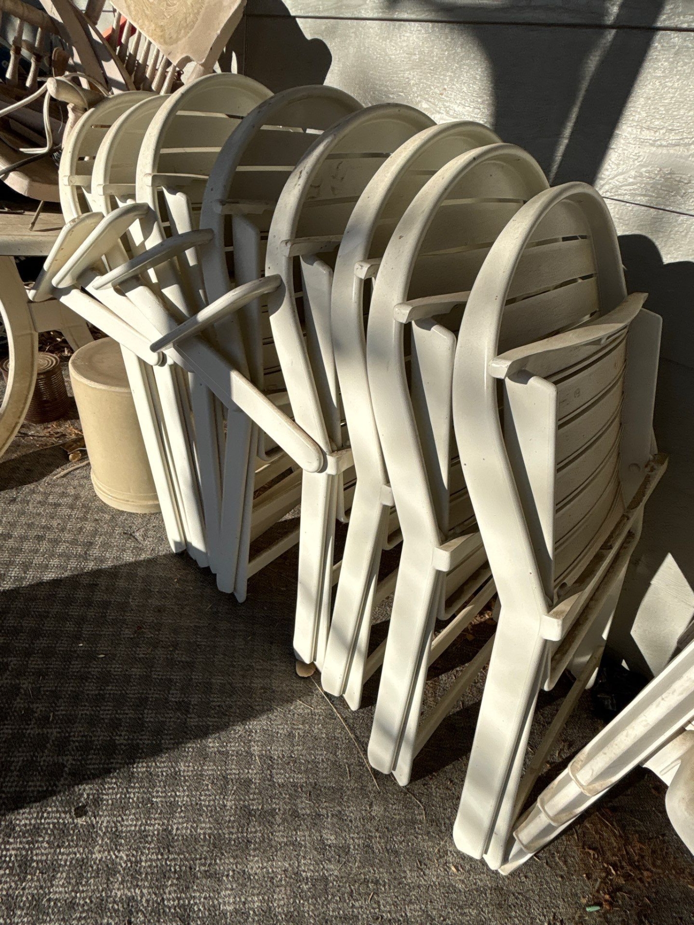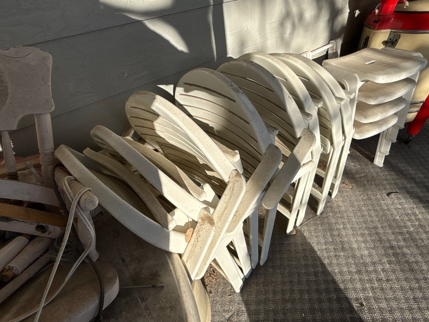 -set of eight plastic lawn chairs, and four stool/leg rest