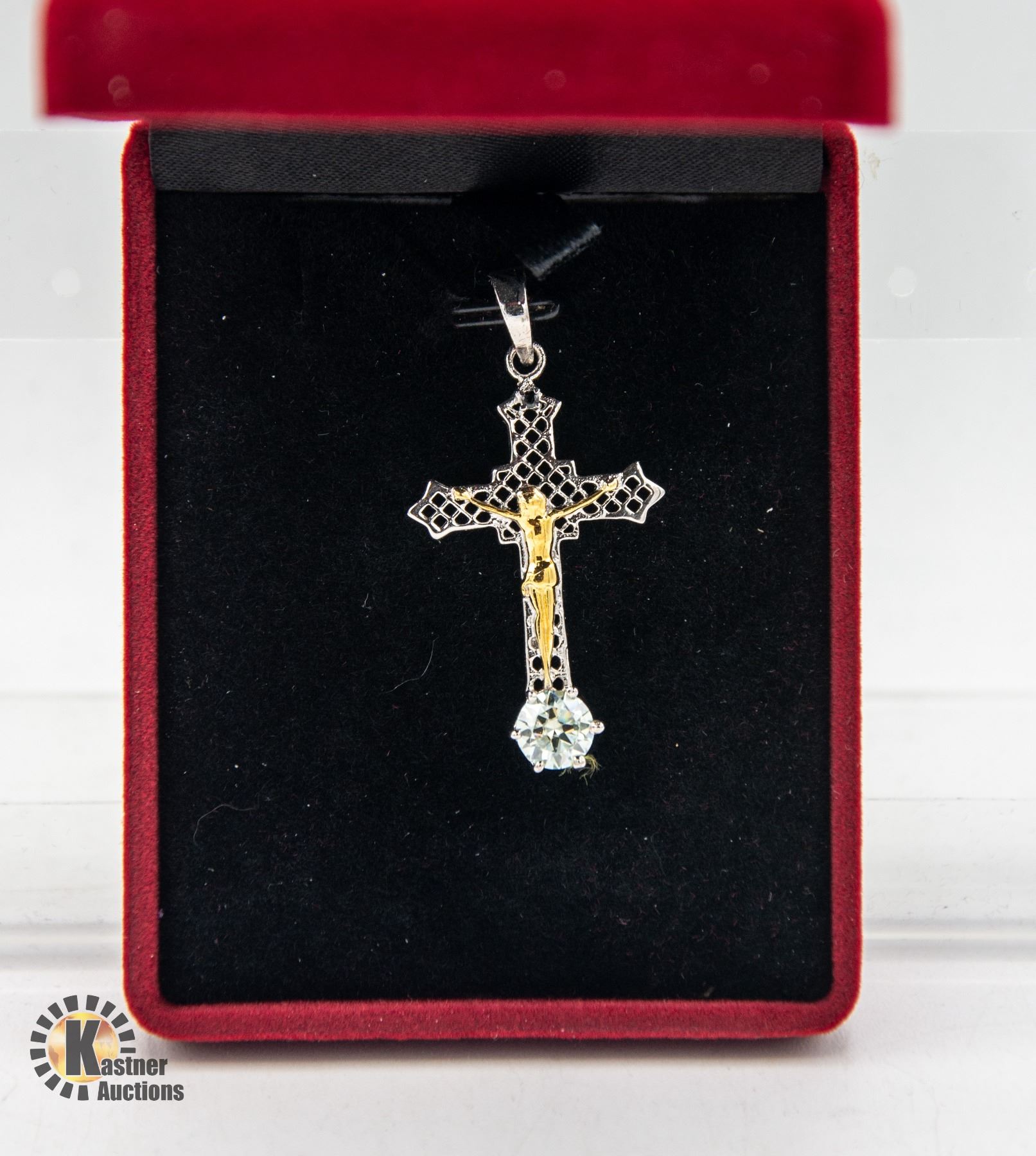 CUT BLUE MOISSANITE SET AT THE BOTTOM OF THE SILVER PLATED CROSS WITH YELLOW GOLD PLATED ON THE CRUCIFIX PENDANT **ALL ITEMS MUST BE REMOVED BY 5PM SATURDAY, MARCH 23RD 2024. ALL REMAINING ITEMS WILL BE SUBJECT TO A $6.00 PER DAY STORAGE CHARGE. ANY ITEMS REMAINING AFTER MONDAY, APRIL 8TH, 2023 WILL BE CONSIDERED FORFEITED. NO REFUNDS WILL BE ISSUED FOR FORFEITED ITEMS. TO SCHEDULE A PICK UP APPOINTMENT CLICK HERE