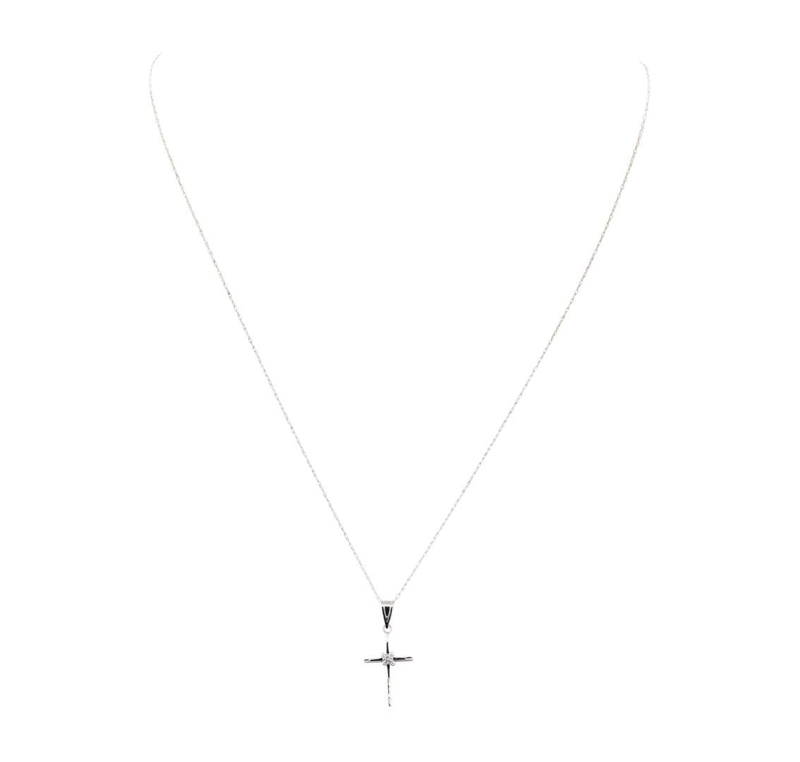 One cross pendant with an attached 18 inch long 0.8mm rope chain featuring: 14KT white gold weighing 1.3 grams containing one diamond weighing 0.01ct.