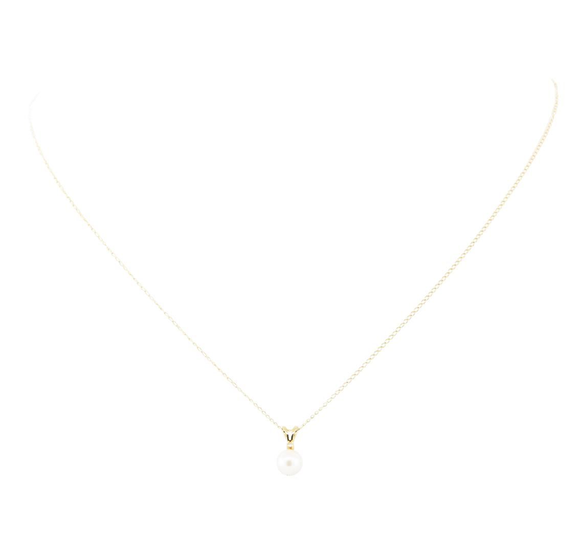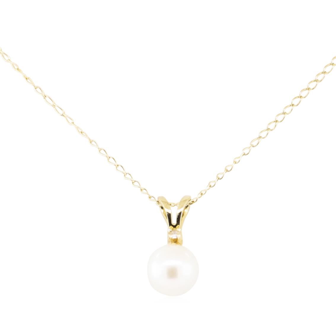 One pendant with an attached sixteen inch long cable link chain featuring: 14KT yellow gold weighing 1.1 grams containing one diamond weighing 0.01ct and one pearl measuring 6.5mm in diameter.