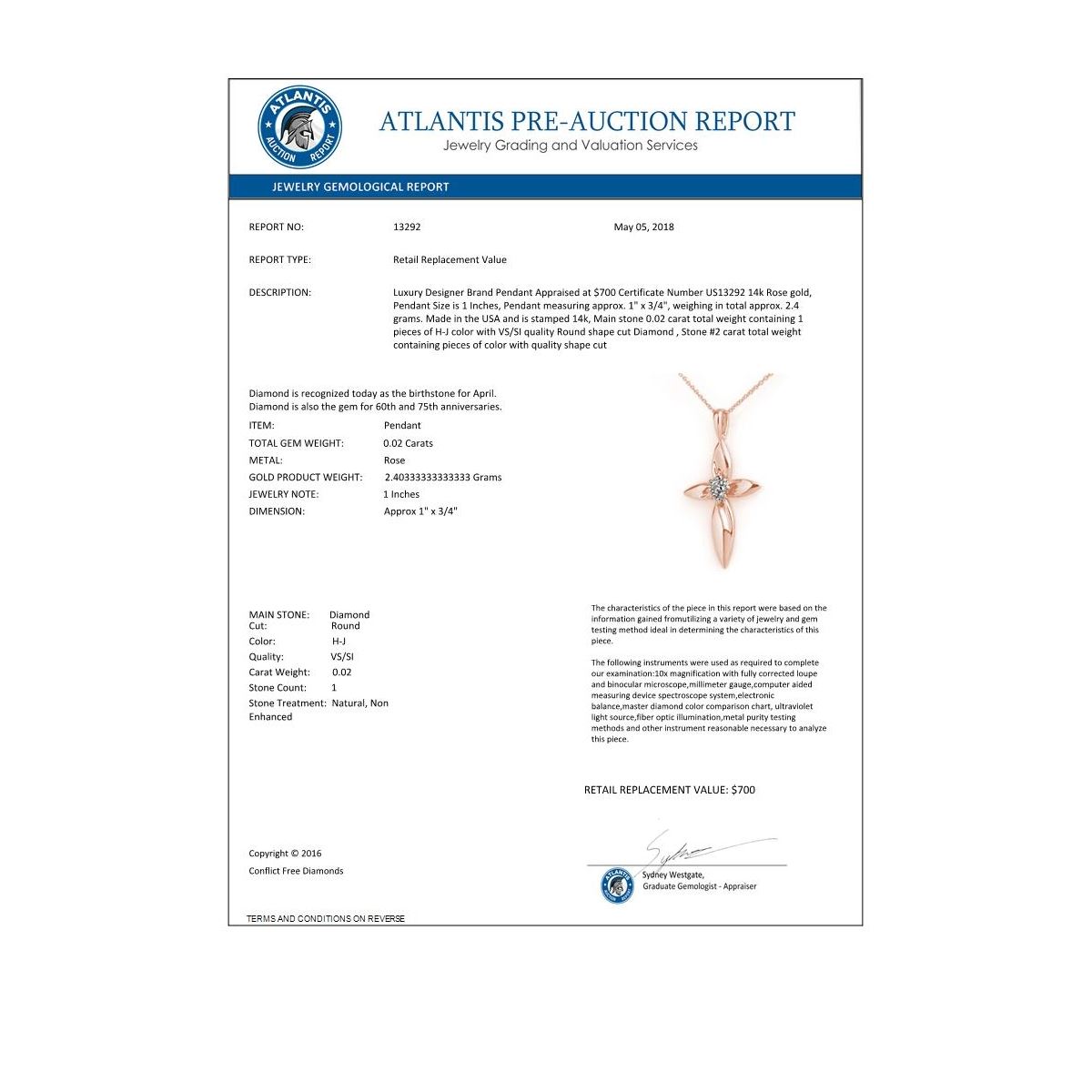 REF-16Y4K -13292 ---- 0.02 CTW Certified VS/SI Diamond Pendant 14K Rose Gold ---- Luxury Designer Brand Pendant Appraised at $700 Certificate Number US13292 14k Rose gold, Pendant Size is 1 Inches, Pendant measuring approx. 1" x 3/4", weighing in total approx. 2.4 grams. Made in the USA and is stamped 14k, Main stone 0.02 carat total weight containing 1 pieces of H-J color with VS/SI quality Round shape cut Diamond , Stone #2 carat total weight containing pieces of color with quality shape cut