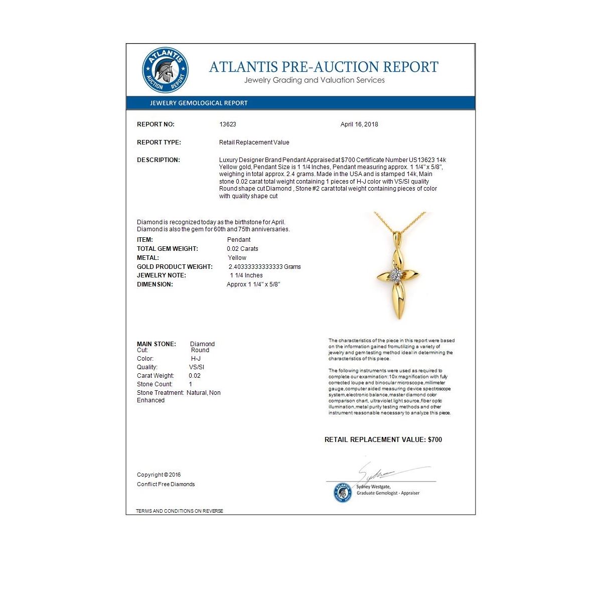 REF-16X2T -13623 ---- 0.02 CTW Certified VS/SI Diamond Pendant 14K Yellow Gold ---- Luxury Designer Brand Pendant Appraised at $700 Certificate Number US13623 14k Yellow gold, Pendant Size is 1 1/4 Inches, Pendant measuring approx. 1 1/4" x 5/8", weighing in total approx. 2.4 grams. Made in the USA and is stamped 14k, Main stone 0.02 carat total weight containing 1 pieces of H-J color with VS/SI quality Round shape cut Diamond , Stone #2 carat total weight containing pieces of color with quality shape cut