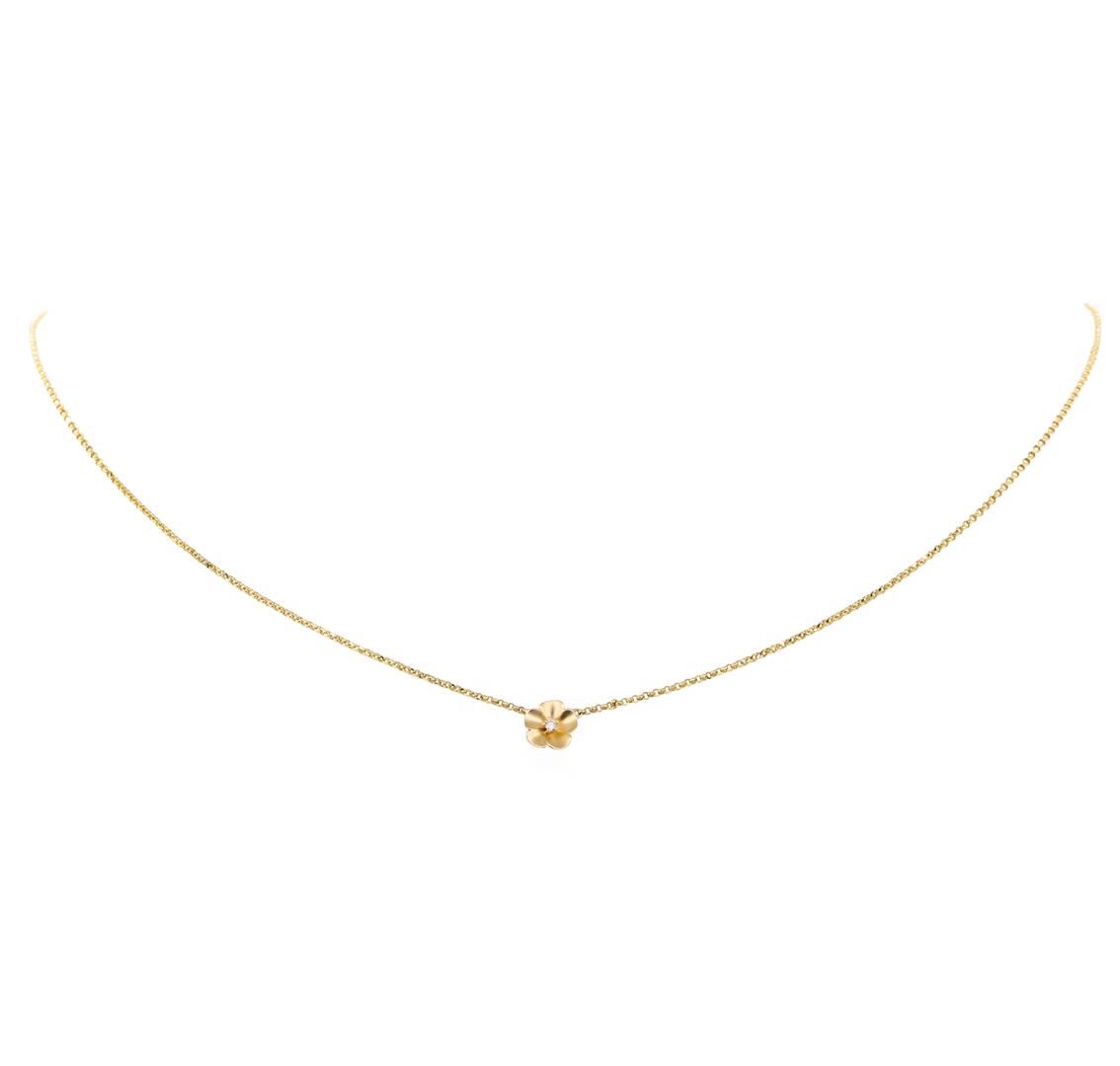 One pendant with chain featuring: 14KT yellow gold weighing 1.9 grams containing one diamond weighing 0.02ct. The pendant has a flower motif and is attached to a 1.1mm rounded cable link chain that can be worn between sixteen and eighteen inches in length.