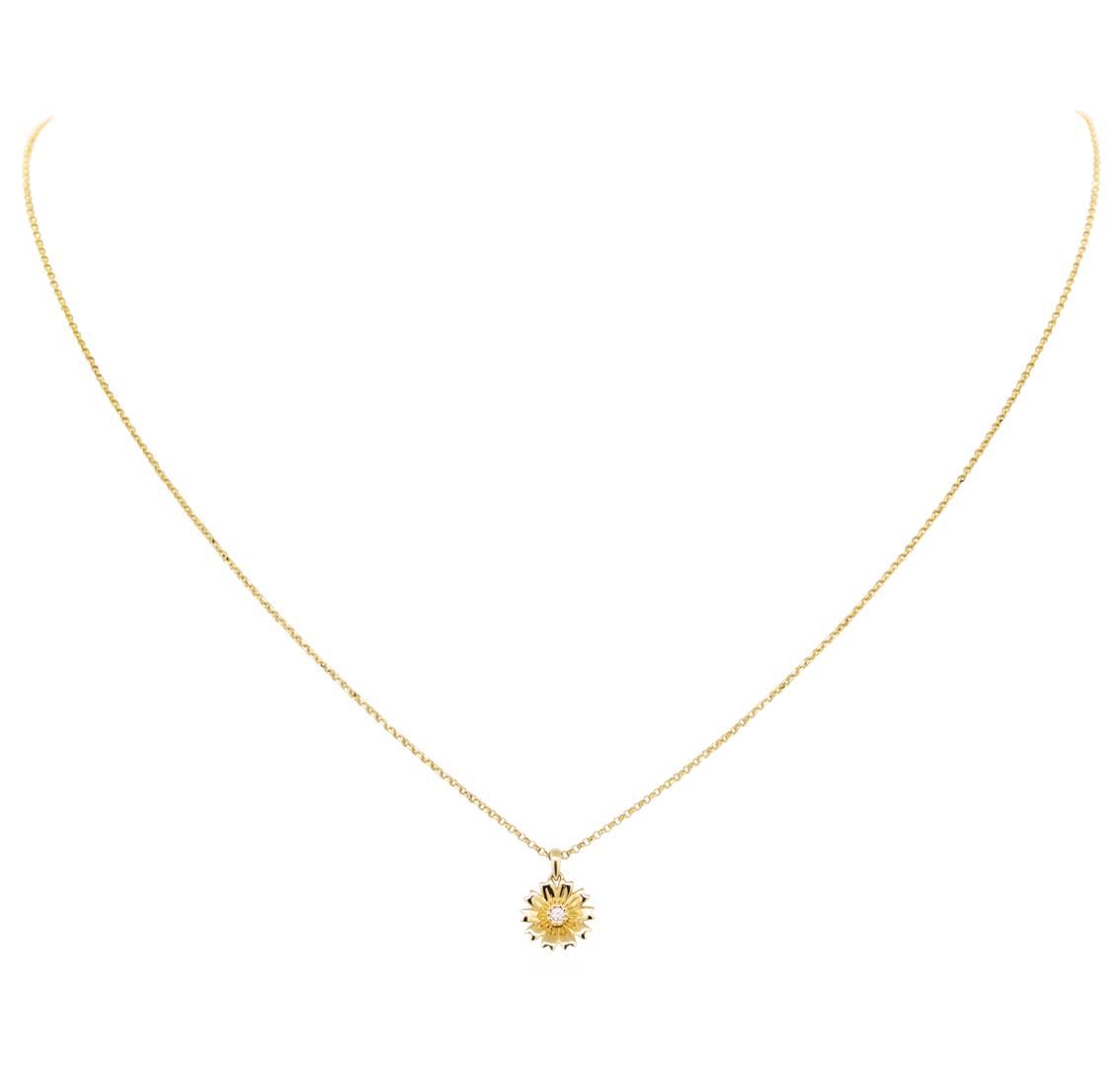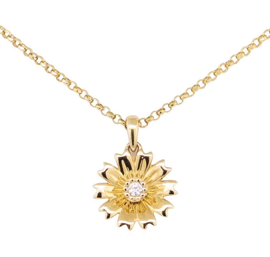 One pendant with chain featuring: 14KT yellow gold weighing 2.1 grams containing one diamond weighing 0.02ct. The pendant has a flower motif and is attached to a 1.2mm rounded cable link chain that can be worn between sixteen and eighteen inches in length.