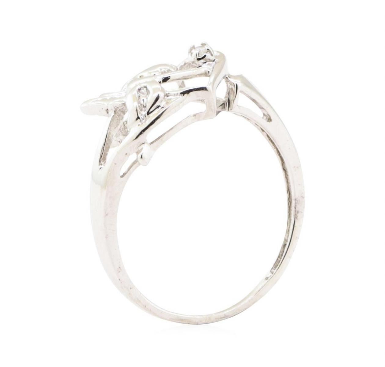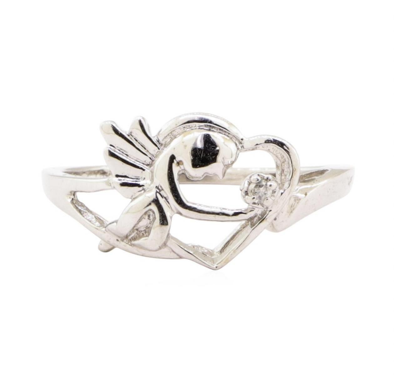 One heart and wing motif ring featuring: 10KT white gold weighing 1.9 grams containing one diamond weighing 0.02ct.