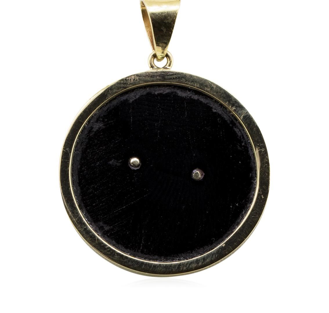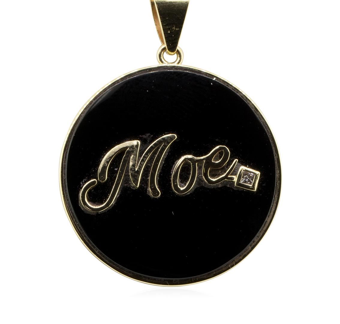 One circular "Moe" pendant with an inlaid piece black onyx featuring: 14KT yellow gold 5.8 grams.
