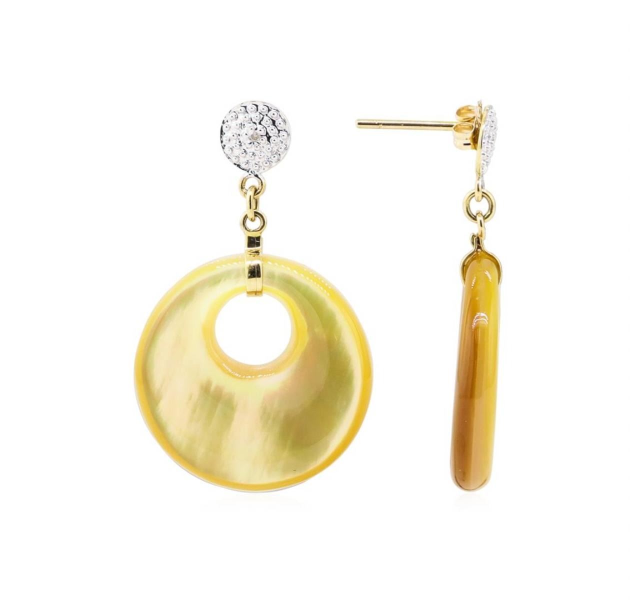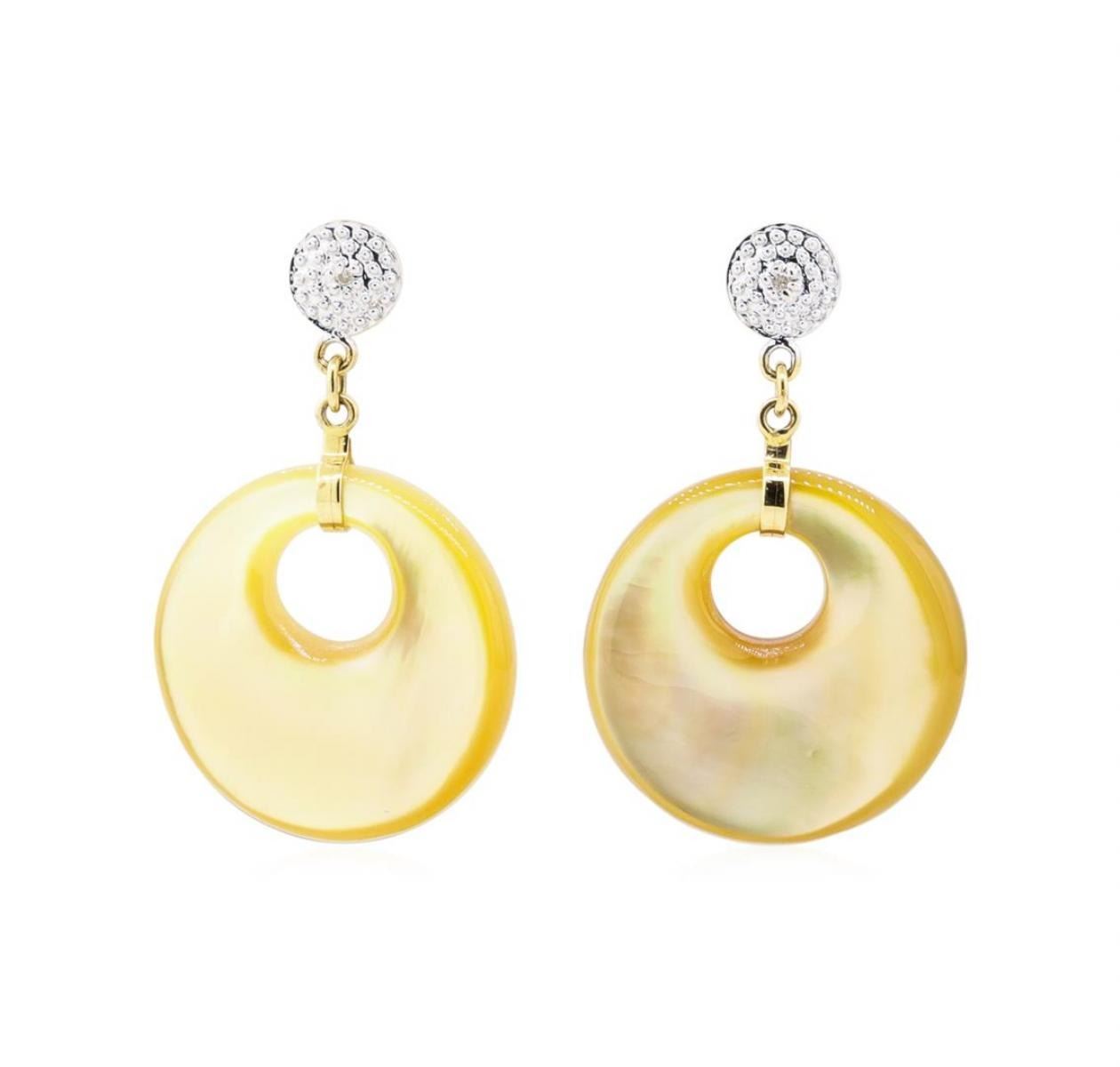 One pair of earrings with a drop of approximately 32 millimeters featuring: 14KT yellow gold weighing 6.2 grams containing two diamonds weighing 0.02ctw and two rounded pieces of mother of pearl.