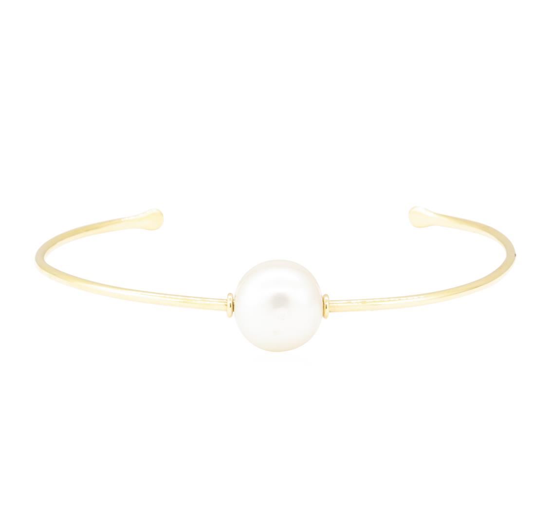 One cuff bracelet featuring: 14KT yellow gold weighing 5.6 grams containing one 11.5mm round freshwater pearl and diamonds weighing 0.02ctw. The cuff has a circumference of approximately six inches.