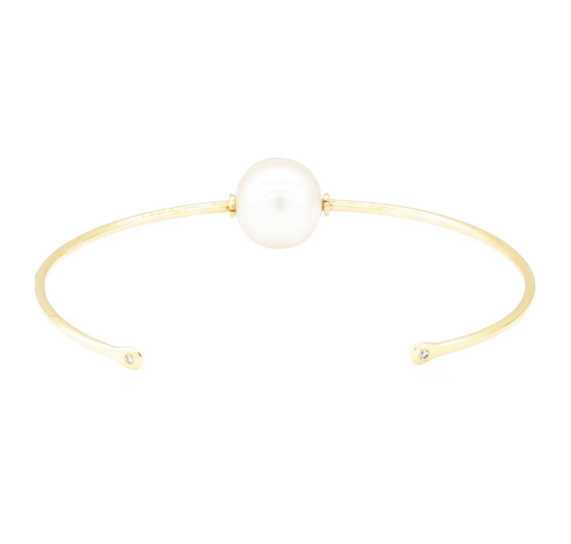 One cuff bracelet featuring: 14KT yellow gold weighing 5.6 grams containing one 11.5mm round freshwater pearl and diamonds weighing 0.02ctw. The cuff has a circumference of approximately six inches.