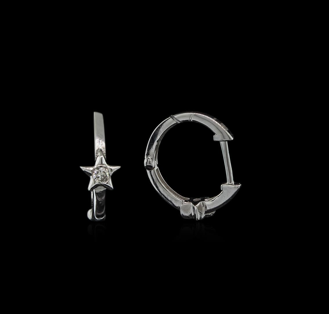One pair of tiny hoop earrings featuring: 14KT white gold weighing 1.22 grams containing bezel set round diamonds with a total weight of 0.03ct.