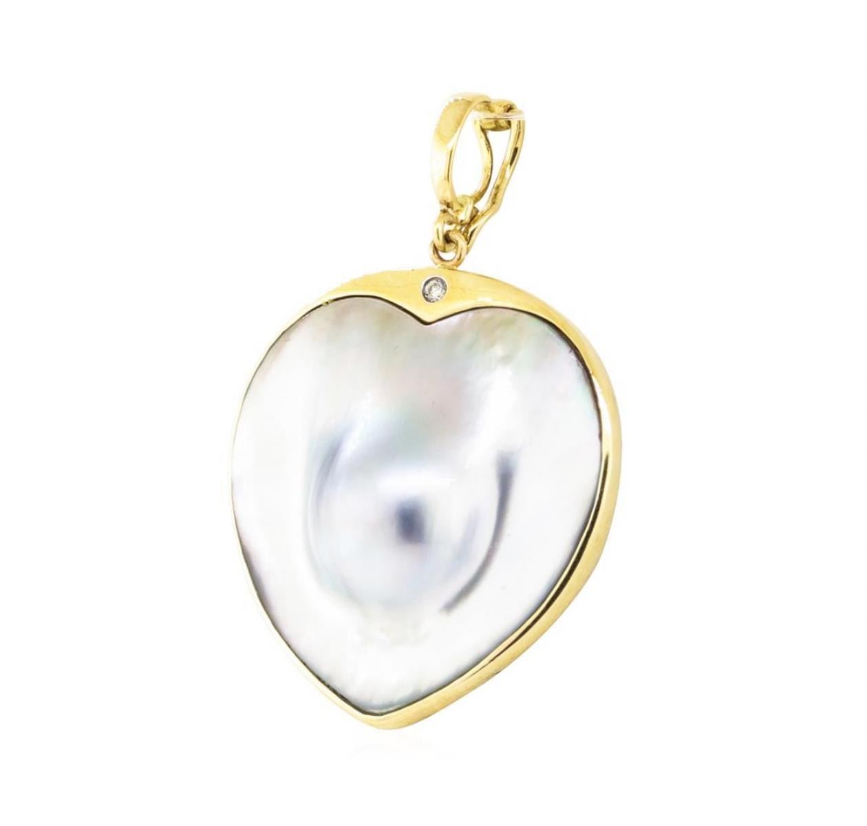 One heart shaped pendant enhancer featuring: 14KT yellow gold weighing 9.6 grams containing one piece of heart shaped black mother of pearl and one diamond weighing 0.03ct.