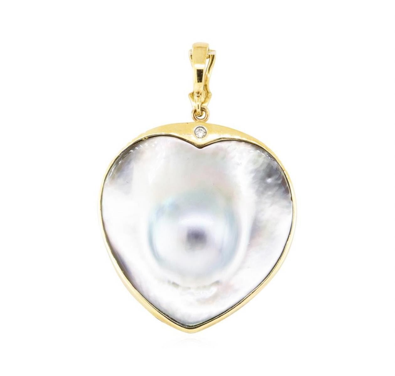 One heart shaped pendant enhancer featuring: 14KT yellow gold weighing 9.6 grams containing one piece of heart shaped black mother of pearl and one diamond weighing 0.03ct.