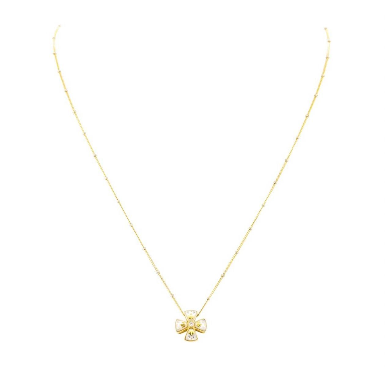 One 18KT yellow gold cross pendant attached to a 14KT yellow gold chain featuring: gold weighing 5.9 grams containing one diamond weighing 0.03ct, one pearl measuring 6.7 millimeter in diameter, and four pieces of inlaid mother of pearl.