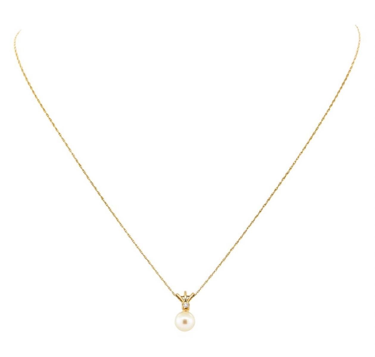 One pendant with an attached sixteen inch long loose rope chain featuring: 14KT yellow gold weighing 1.3 grams containing one diamond weighing 0.03ct and one white colored pearl measuring approximately 6.5mm in diameter.