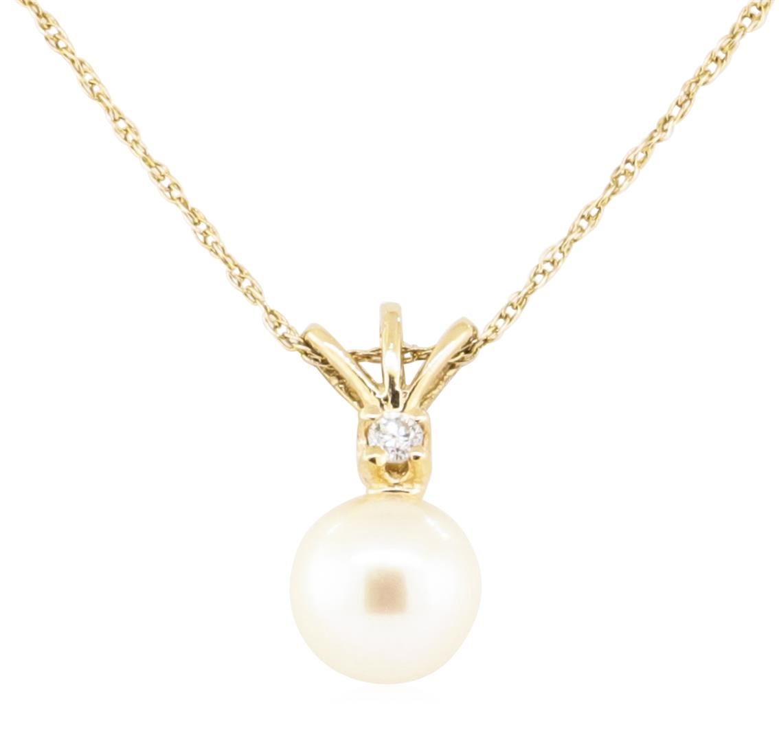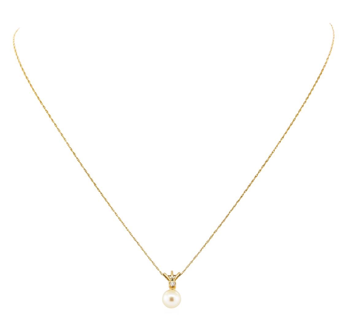 One pendant with an attached sixteen inch long loose rope chain featuring: 14KT yellow gold weighing 1.3 grams containing one diamond weighing 0.03ct and one white colored pearl measuring approximately 6.5mm in diameter.