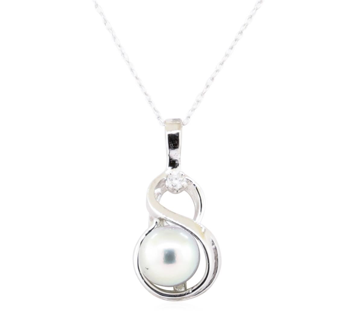 One infinity motif pendant with an attached eighteen inch long fine rope chain featuring: 10KT white gold weighing 2.3 grams containing one silver colored pearl and diamonds weighing 0.03ctw.