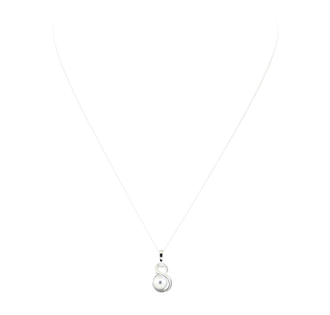One infinity motif pendant with an attached eighteen inch long fine rope chain featuring: 10KT white gold weighing 2.3 grams containing one silver colored pearl and diamonds weighing 0.03ctw.