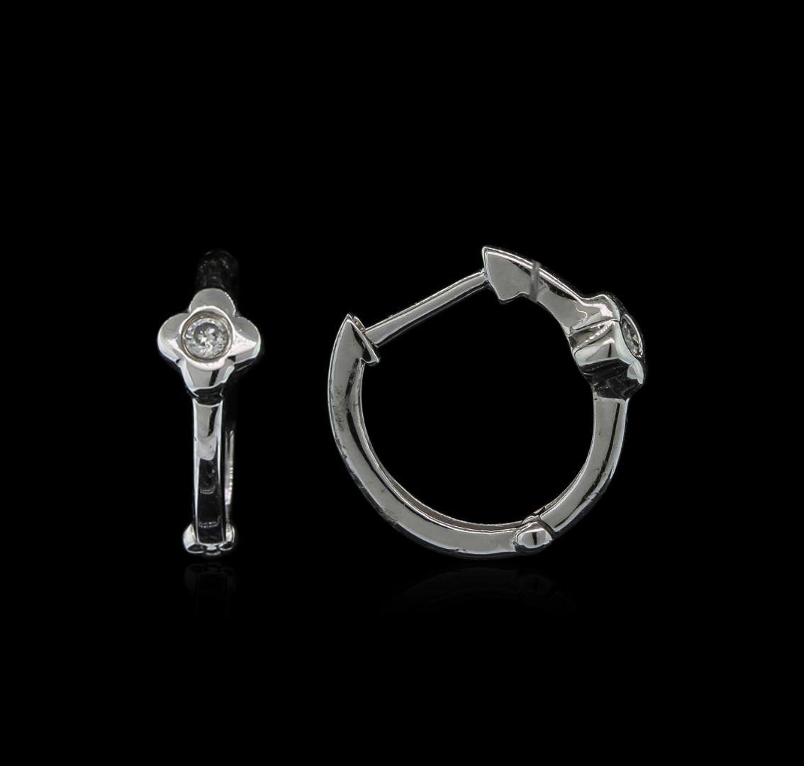 One pair of tiny hoop earrings featuring: 14KT white gold weighing 1.33 grams containing bezel set round diamonds with a total weight of 0.03ct.