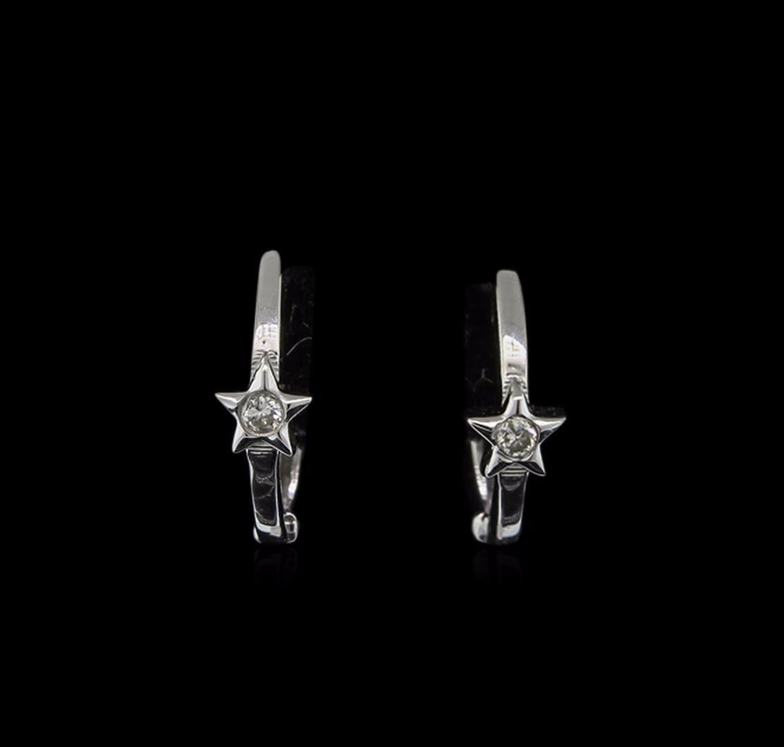 One pair of tiny hoop earrings featuring: 14KT white gold weighing 1.20 grams containing bezel set round diamonds with a total weight of 0.03ct.