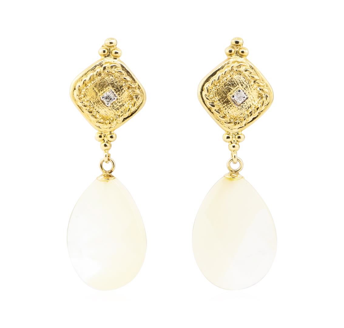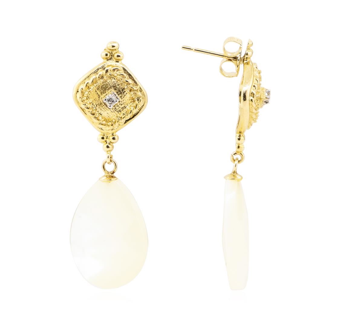 One pair of mother of pearl dangle earrings with a drop of approximately 40 millimeters featuring: 14KT yellow gold weighing 5.5 grams containing diamonds weighing 0.04ctw.