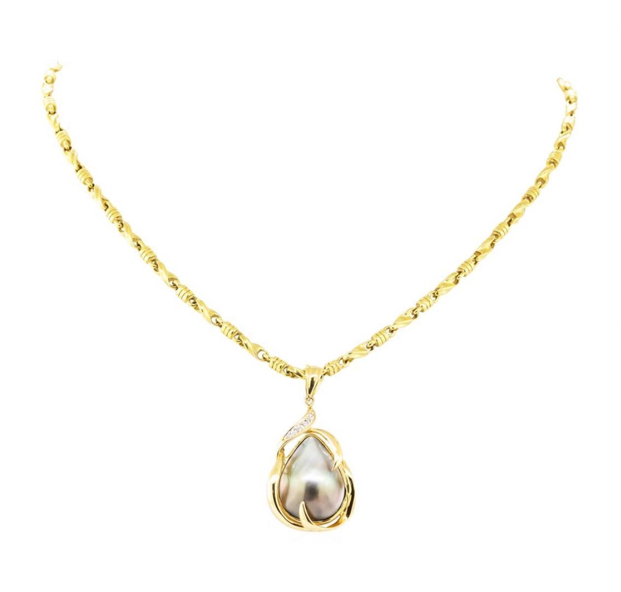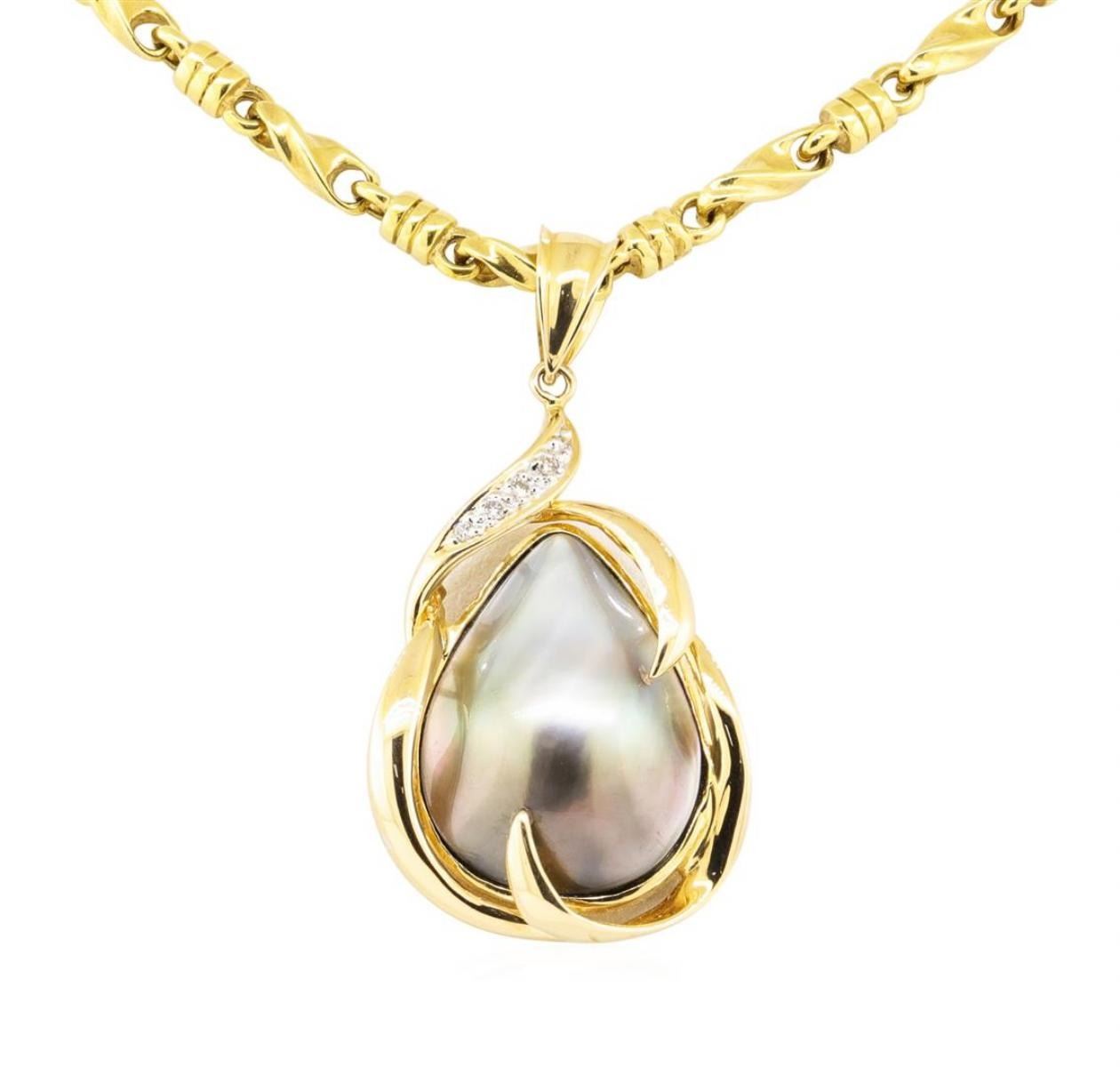 One electronically tested 14KT yellow gold lady's combination cast & assembled fashion pendant & chain 18.0' long, 3.3mm twisted custom link with a lobster claw clasp with a bright polish finish. The featured pendant contains one pear shaped inlaid black mabe pearl measuring 22 by 16 millimeters. Identified with markings of '14K'. Condition is like new, good workmanship. Containing: Five bead set round brilliant cut diamonds, measuring 1.30 - 1.25 x 0.79mm (depth est.) approximate total weight of 5 Stones = 0.04ct. Graded in the setting. Color H - I Clarity VS-2 to SI-1 Cut Good. Total Weight of Diamonds 0.04ct.. Total Weight of Pendant & Chain 35.10gm GAS Appraised at $5255.00. GAS Appraised.