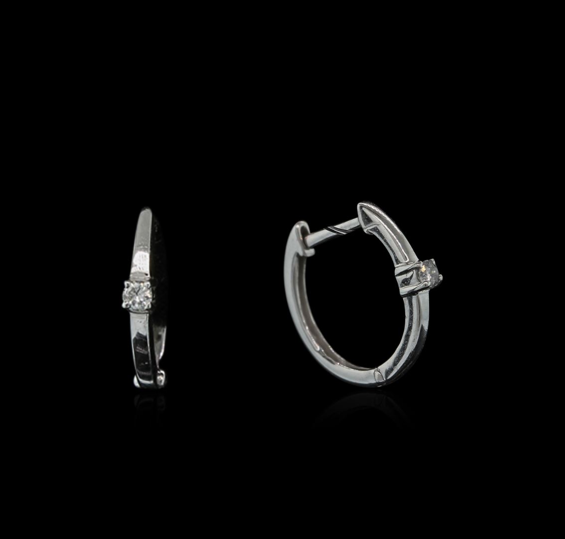 One pair of tiny hoop earrings featuring: 14KT white gold weighing 0.80 grams containing prong set round diamonds with a total weight of 0.04ct.