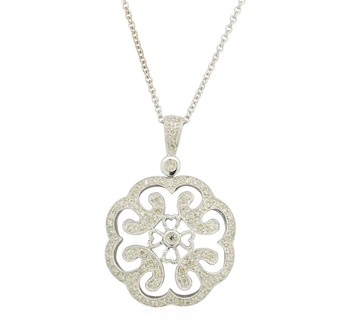 One electronically tested 14KT white gold lady's combination cast & assembled fashion pendant & chain 18.0' long, 1.5mm round cable link with a spring ring clasp with a bright polish finish. Identified with markings of '14K'. Condition is new, good workmanship. Containing: Two bezel set round brilliant cut diamonds, measuring 1.90 - 1.85 x 1.17mm (depth est.) approximate total weight of 2 Stones = 0.05ct. Graded in the setting. Color H - I Clarity SI-1 to SI-2 Cut Very Good Eighty prong set round brilliant cut diamonds, measuring 1.40 - 1.30 x 0.84mm (depth est.) approximate total weight of 80 Stones = 0.75ct. Graded in the setting. Color H - I Clarity SI-2 to I-1 Cut Good. Total Weight of Diamonds 0.80ct.. Total Weight of Pendant & Chain 9.10gm GAS Appraised at $2825.00. GAS Appraised.