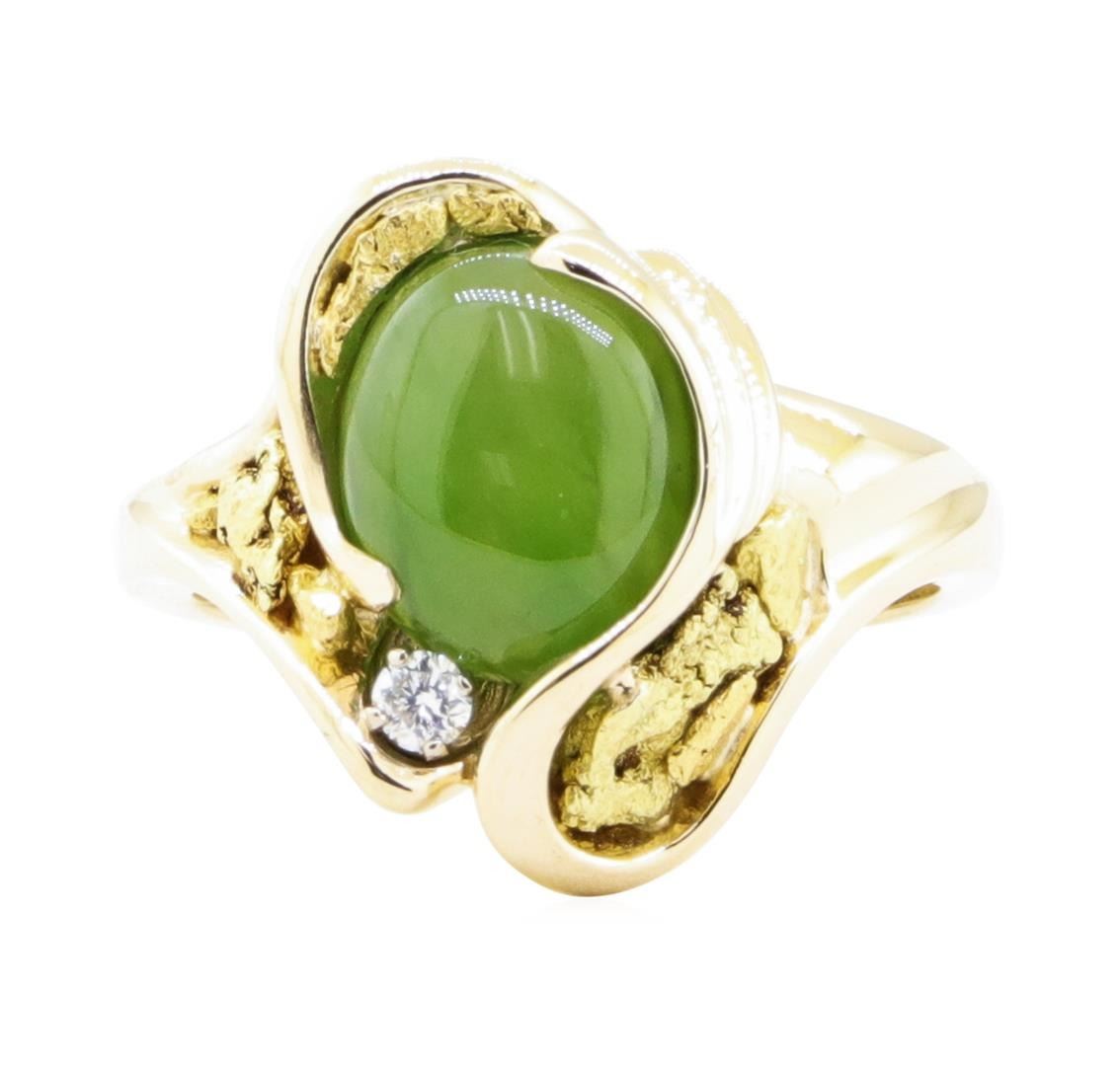 One ring featuring: 14KT yellow gold with inlaid 24KT gold nuggets weighing 7.8 grams containing one diamond weighing 0.05ct and one oval cabochon jade measuring 10mm by 8.8mm