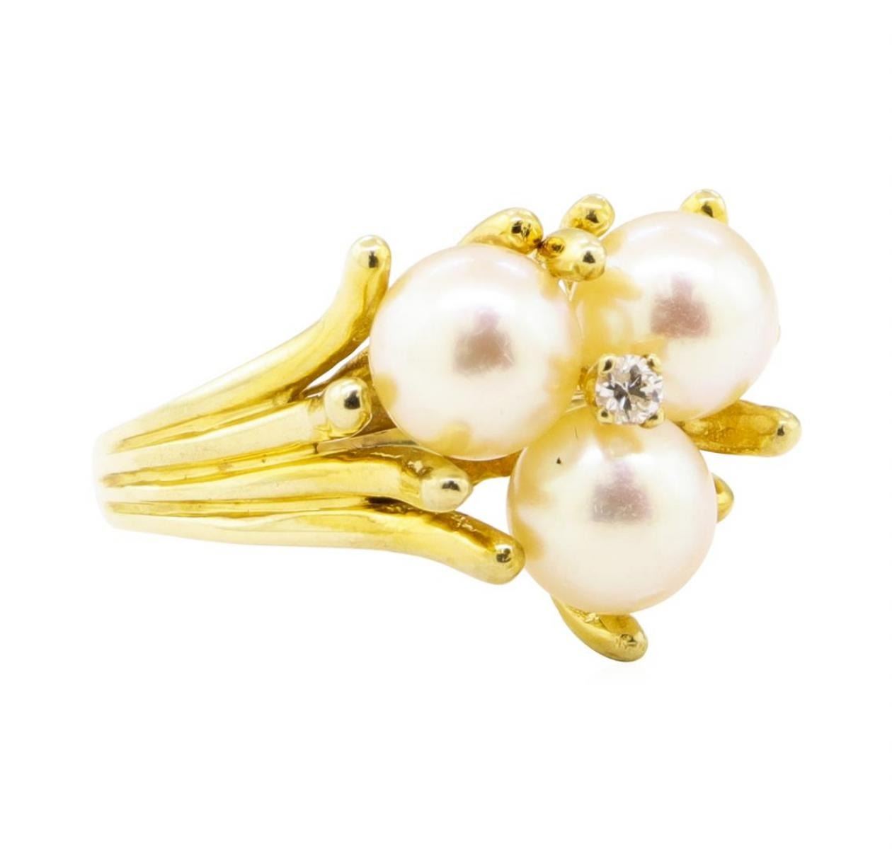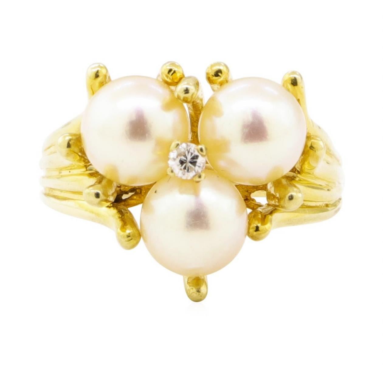 One ring featuring: 14KT yellow gold weighing 7.7 grams containing one diamond weighing 0.05ct and three pearls measuring 7.3 millimeters in diameter