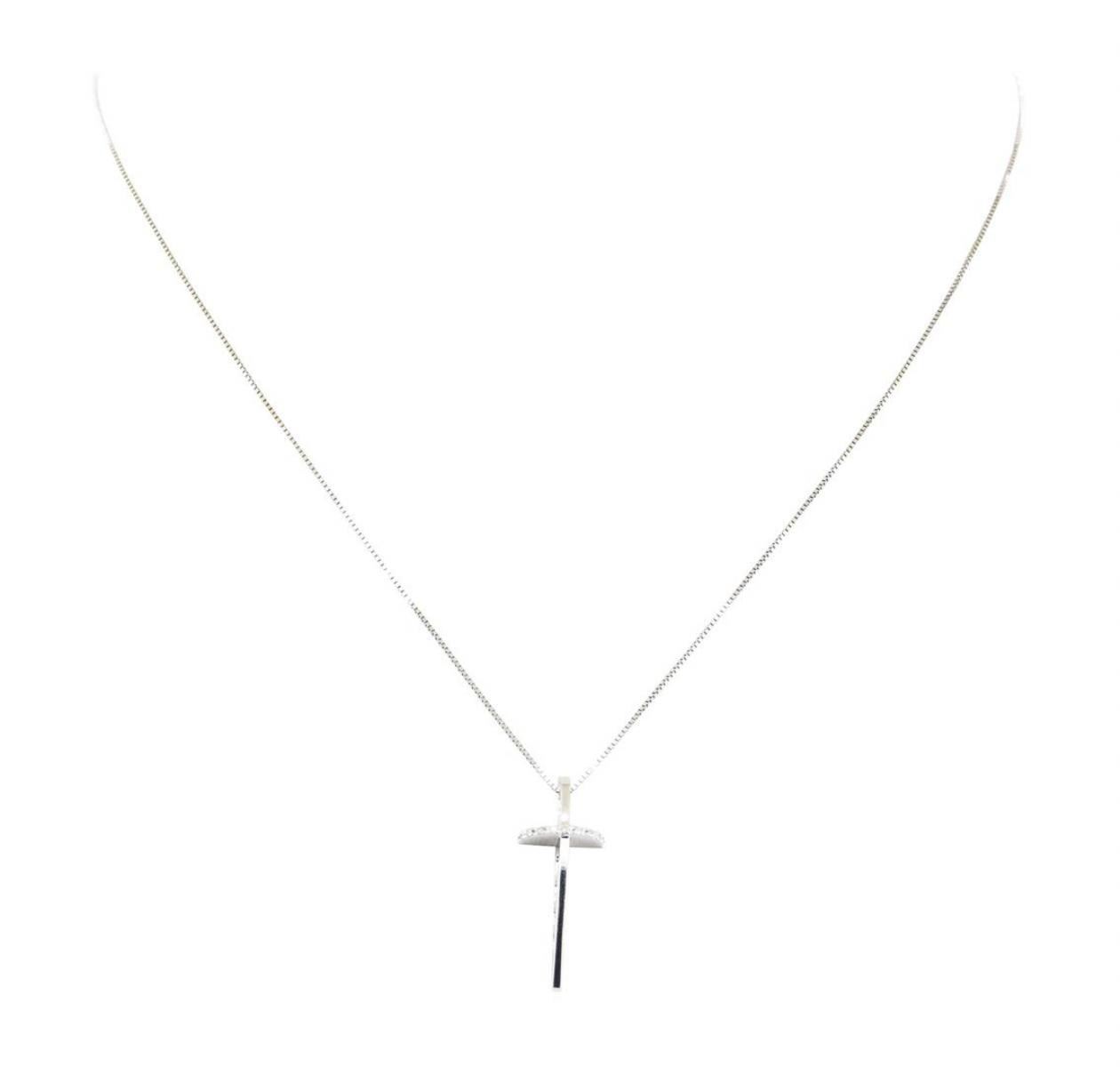 One cross shaped pendant with an attached 14KT white gold chain featuring: 14KT and 18KT white gold weighing 2.5 grams containing diamonds weighing 0.06ctw. The chain is a 0.6mm box link chain measuring sixteen inches in length.