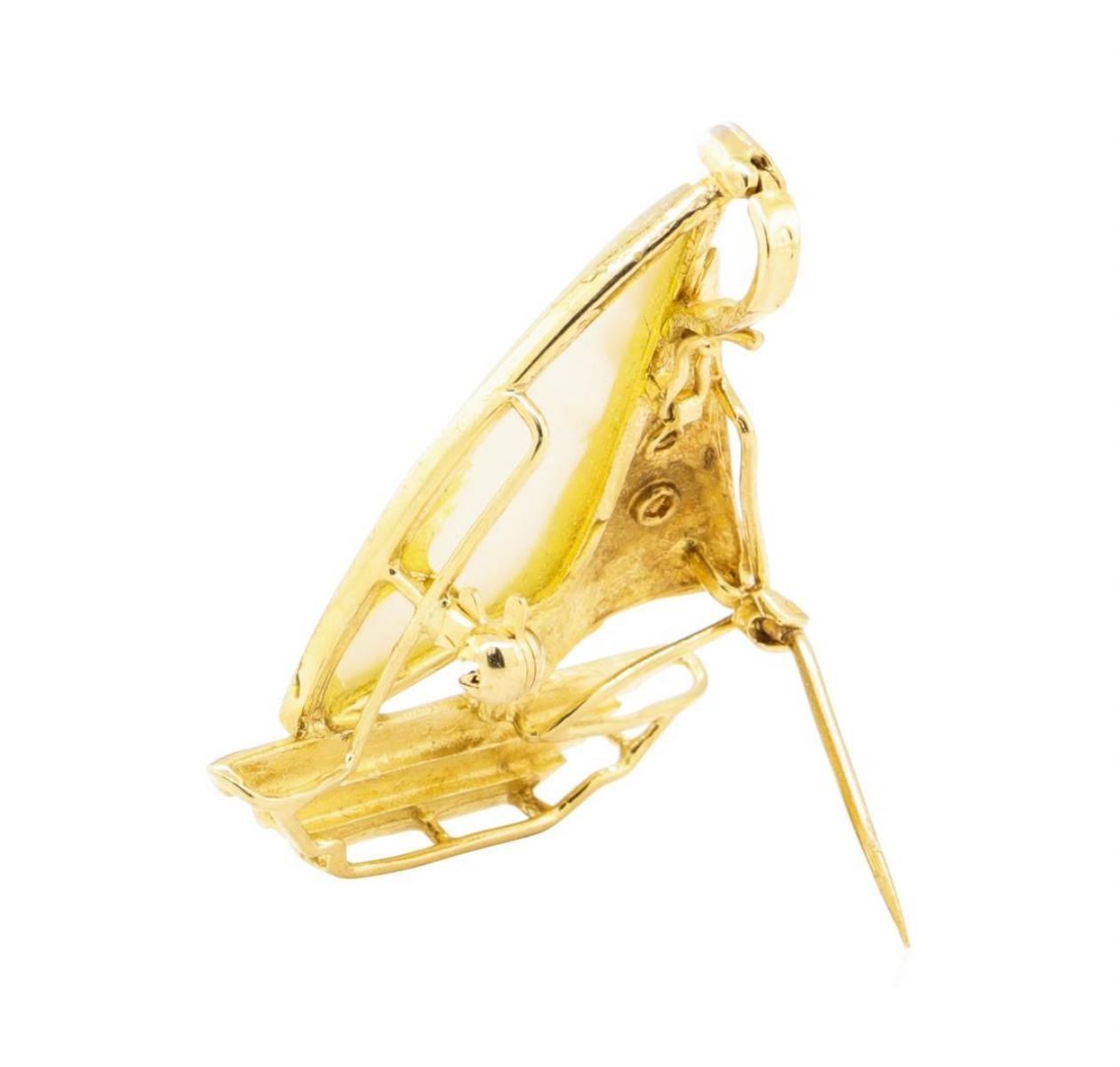 One boat shaped enhancer/pin measuring 35 millimeters in length featuring: 14KT yellow gold weighing 6.2 grams containing one piece of mother of pearl and diamonds weighing 0.06ctw.