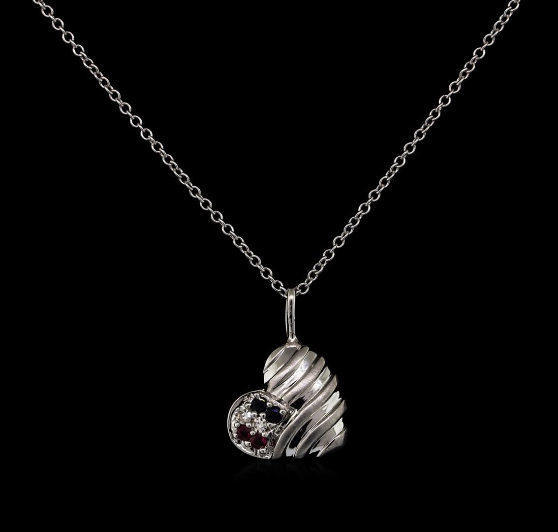 One pendant with chain featuring: 14KT white gold weighing 2.20 grams containing rubies with a total weight of 0.06ct, blue sapphires with a total weight of 0.06ct, and diamonds with a total weight of 0.04ct.