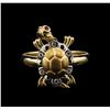 One electronically tested 14KT yellow and white gold lady's combination cast & assembled fashion ring with a bright polish finish. The featured lady's ring has a moving turtle motif with a 2.63 millimeter wide shank. Identified with markings of "14K". Condition is new, good workmanship. Containing: Two bezel set round standard brilliant cut natural rubies, measuring 1.60 - 1.55 x 1.02 mm, approximate. Total Weight of 0.06ct., clarity is eye clean, type II, medium, very slightly brownish, strongly purplish red color, (GIA stpR 5/3), cut is good. Colored gemstones are presumed to have been subjected to commonly used enhancement processes. Graded in the setting. Six bezel set round brilliant cut diamonds, measuring 1.50 - 1.40 x 0.94mm (depth est.) approximate. Total Weight of 6 Stones = 0.08ct. Graded in the setting. Clarity: VS-2 to SI-1. Color: H - I. Cut Good. Total Weight of Colored Stones 0.06ct. Total Weight of Diamonds 0.08ct. Total Weight of Ring 4.80gm. GAS Appraised at $1,140.00.