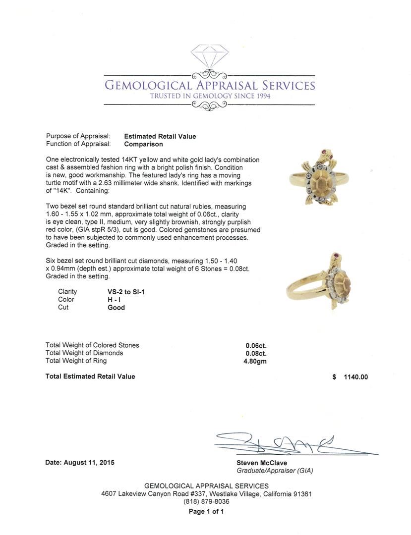 One electronically tested 14KT yellow and white gold lady's combination cast & assembled fashion ring with a bright polish finish. The featured lady's ring has a moving turtle motif with a 2.63 millimeter wide shank. Identified with markings of "14K". Condition is new, good workmanship. Containing: Two bezel set round standard brilliant cut natural rubies, measuring 1.60 - 1.55 x 1.02 mm, approximate. Total Weight of 0.06ct., clarity is eye clean, type II, medium, very slightly brownish, strongly purplish red color, (GIA stpR 5/3), cut is good. Colored gemstones are presumed to have been subjected to commonly used enhancement processes. Graded in the setting. Six bezel set round brilliant cut diamonds, measuring 1.50 - 1.40 x 0.94mm (depth est.) approximate. Total Weight of 6 Stones = 0.08ct. Graded in the setting. Clarity: VS-2 to SI-1. Color: H - I. Cut Good. Total Weight of Colored Stones 0.06ct. Total Weight of Diamonds 0.08ct. Total Weight of Ring 4.80gm. GAS Appraised at $1,140.00.